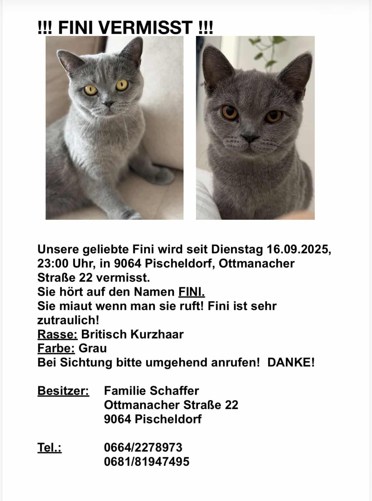 Unsere geliebte Fini wird vermisst. Sie ist am 16.09.2025, gegen 23:00 Uhr entlaufen. Eventuell ist es ihnen möglich dies zu teilen. Sollte sich jemand bei Ihnen melden bitte ich um Weitergabe der Telefonnummern.