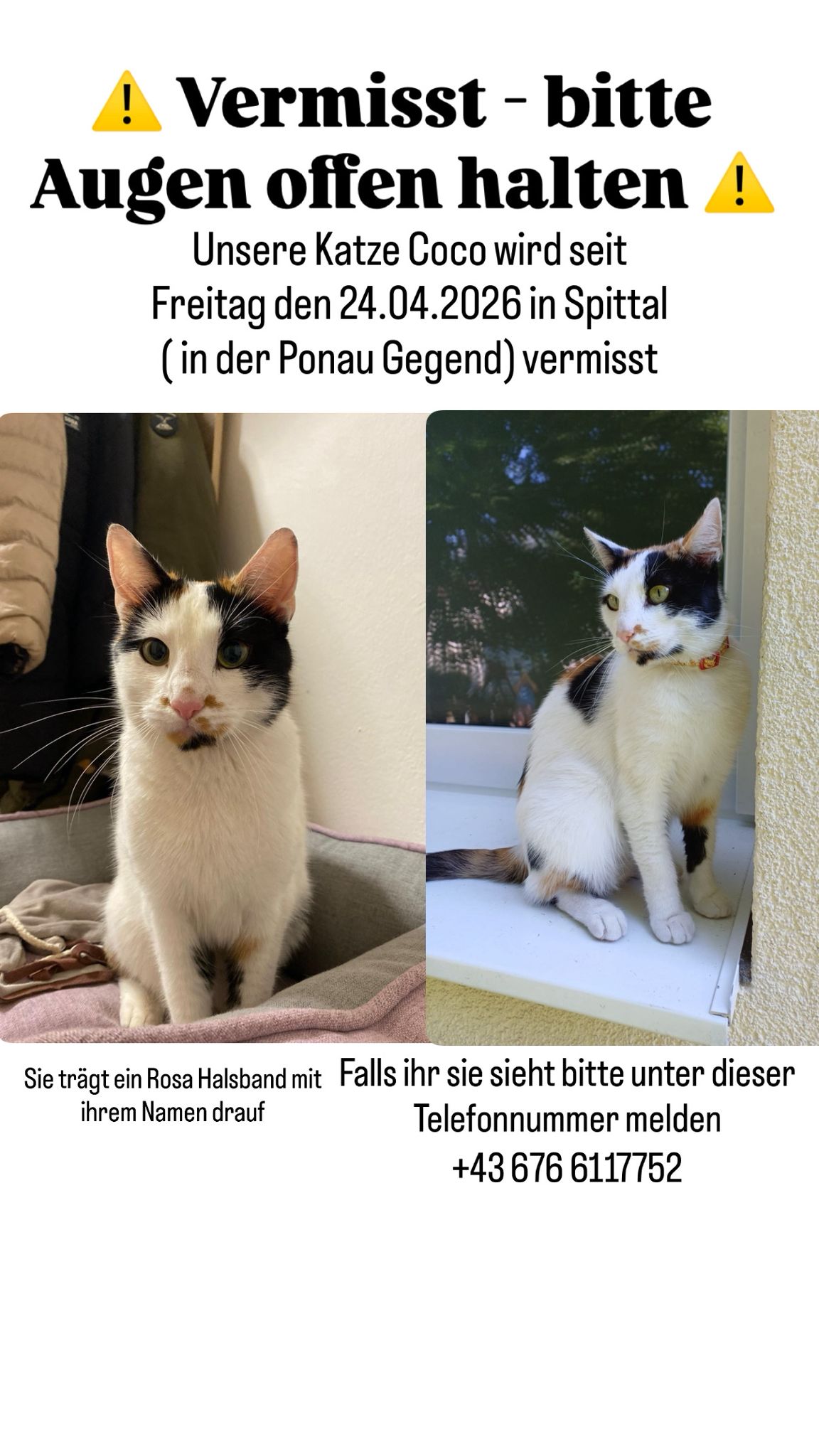 Coco wurde zum letzten Mal am Freitag den 24.042026 bei der Unterführung in der Liesersiedlung in Spittal an der Drau gesehen.